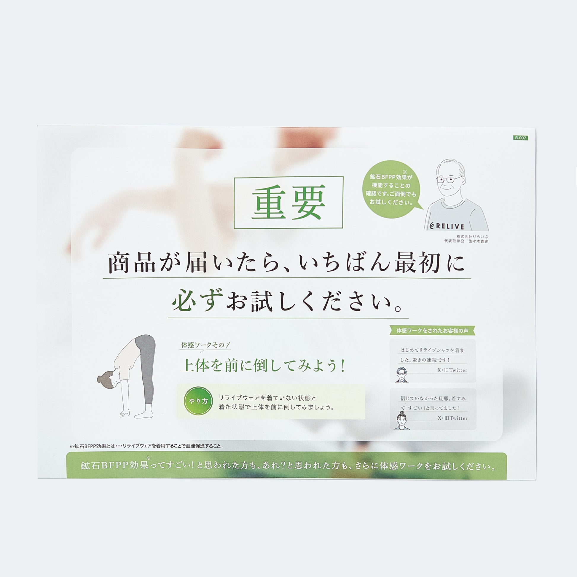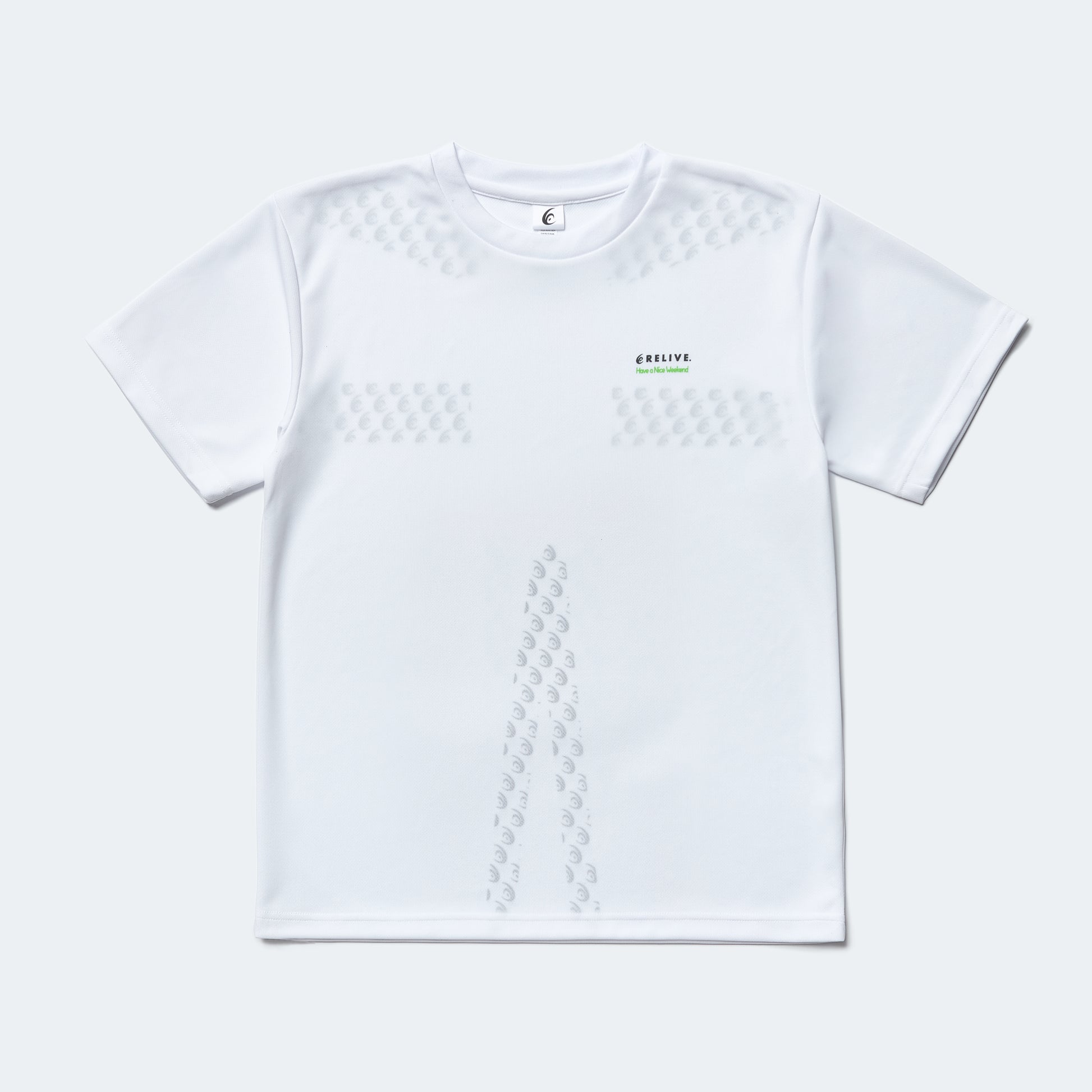 リライブシャツは、特許技術の鉱石プリントにより筋肉や経絡にやさしく働きかけ、着るだけで姿勢を整え、動きをサポートする次世代ウェアです。